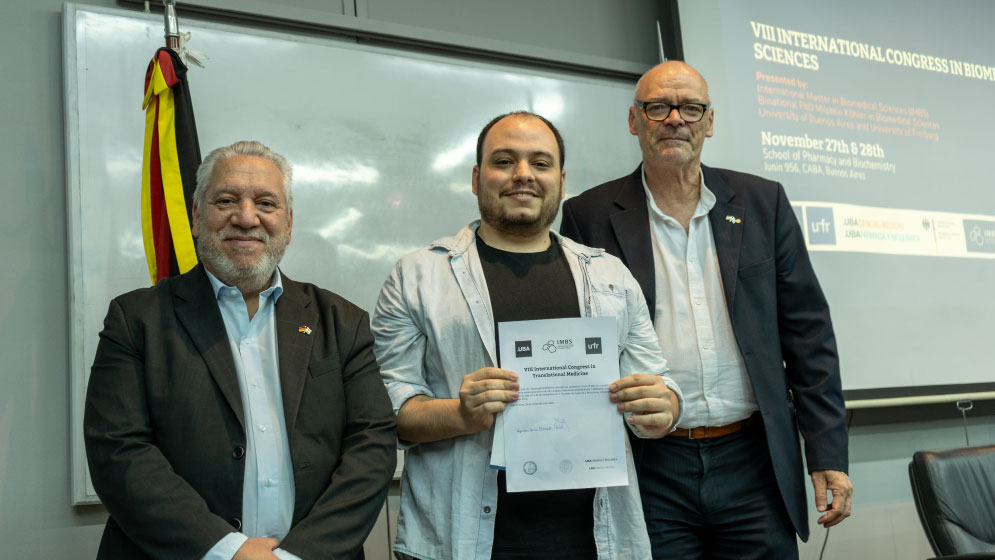 El Bioq. Agustín Byrne obtuvo el premio otorgado a los tres mejores trabajos en el marco del VIII Congreso Internacional de Medicina Traslacional organizado por el International Master Program in Biomedical Sciences (IMBS) y el Binational PhD Milstein-Köhler in Biomedical Sciences, por su presentación “Towards non-invasive gold nanoparticle-based therapies for central nervous system diseases” cuyos autores son Byrne Agustin Jesus, Pérez María Julia, Lázaro Martínez Juan Manuel, Franco Paula (investigadora responsable).